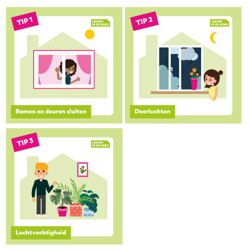 In warme periodes kunt u het beste deuren, ramen en gordijnen gesloten houden tijdens de heetste momenten van de dag. Zet ramen ’s morgens vroeg, ‘s avonds en ’s nachts open om koele lucht binnen te laten. Ook in koudere periodes is het belangrijk om goed te ventileren.